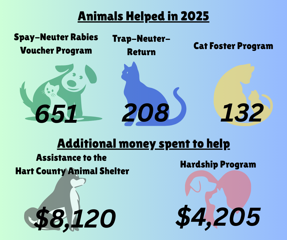All of ARK’s programs were fully funded in 2025, thanks to the generosity of donors, members, and sponsors. Carry-over funds allowed us to spend more than we made. As usual, our greatest expense was for vet care: $63,140. Vet care is essential for our programs: low-cost Spay-Neuter-Rabies (SNR) voucher sales to the general public, Trap-Neuter-Return (TNR) for stray cats, Hardship and Cat Foster. Another big expense was for a concrete pad at the Hart County Animal Shelter to improve drainage and prevent disease, which cost $8,120.